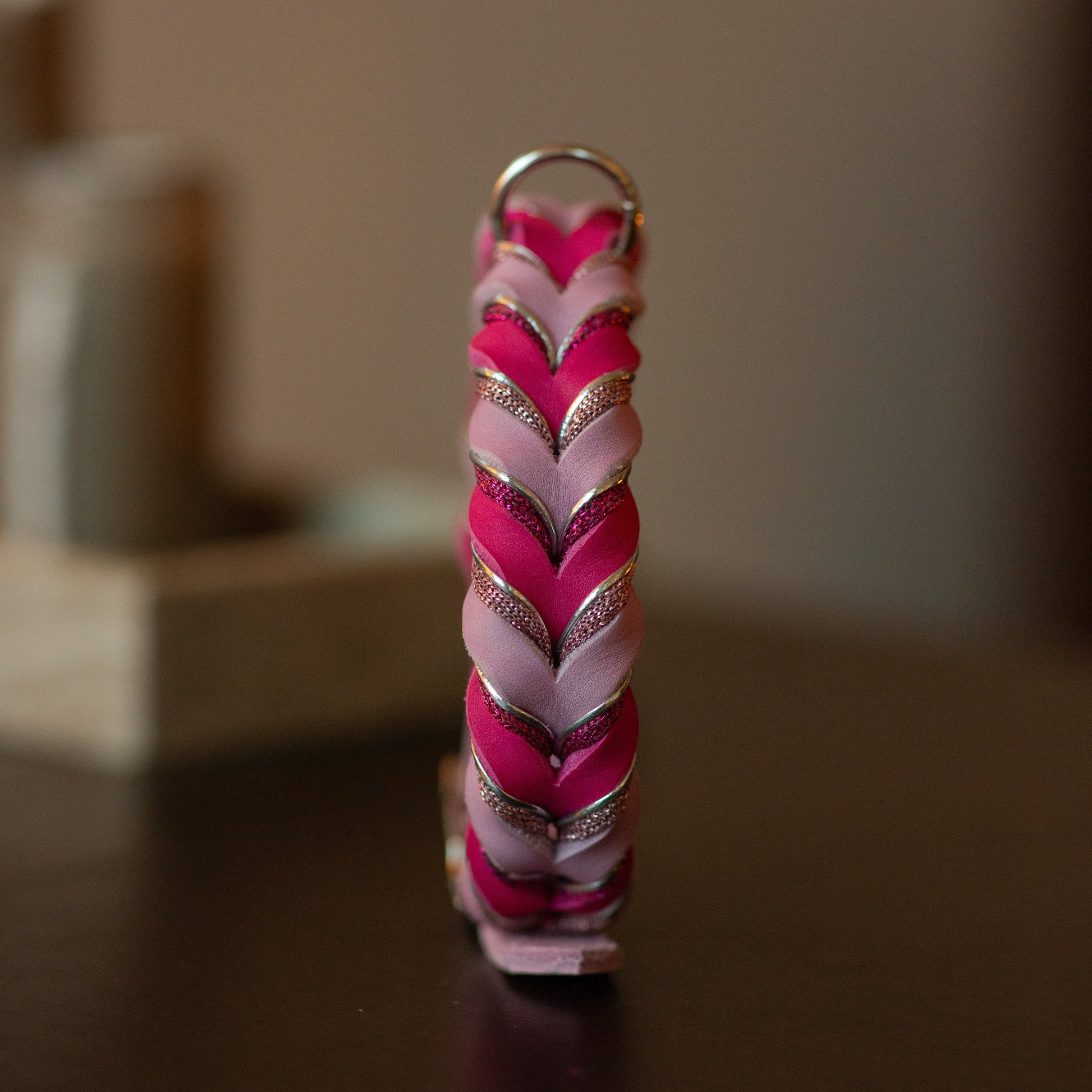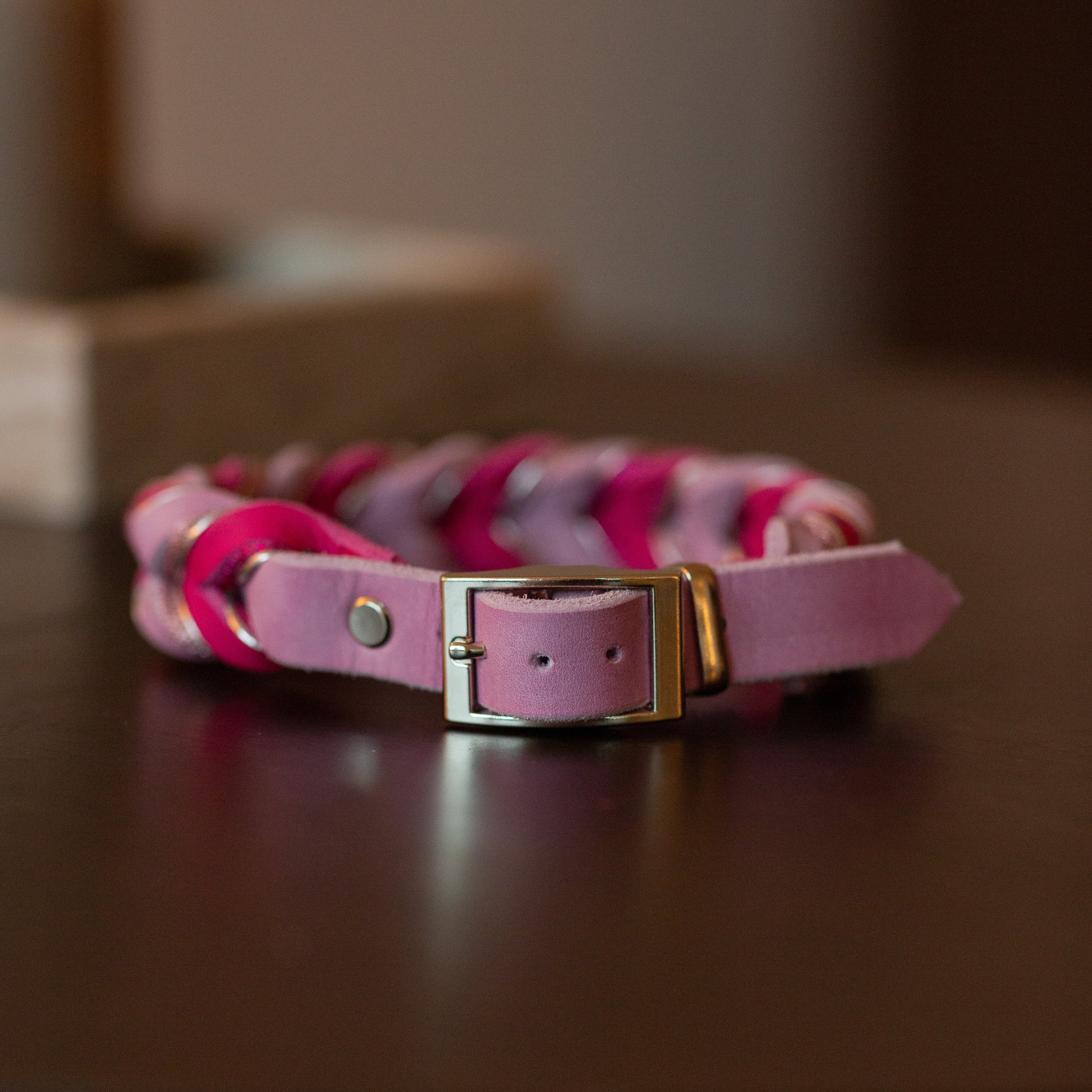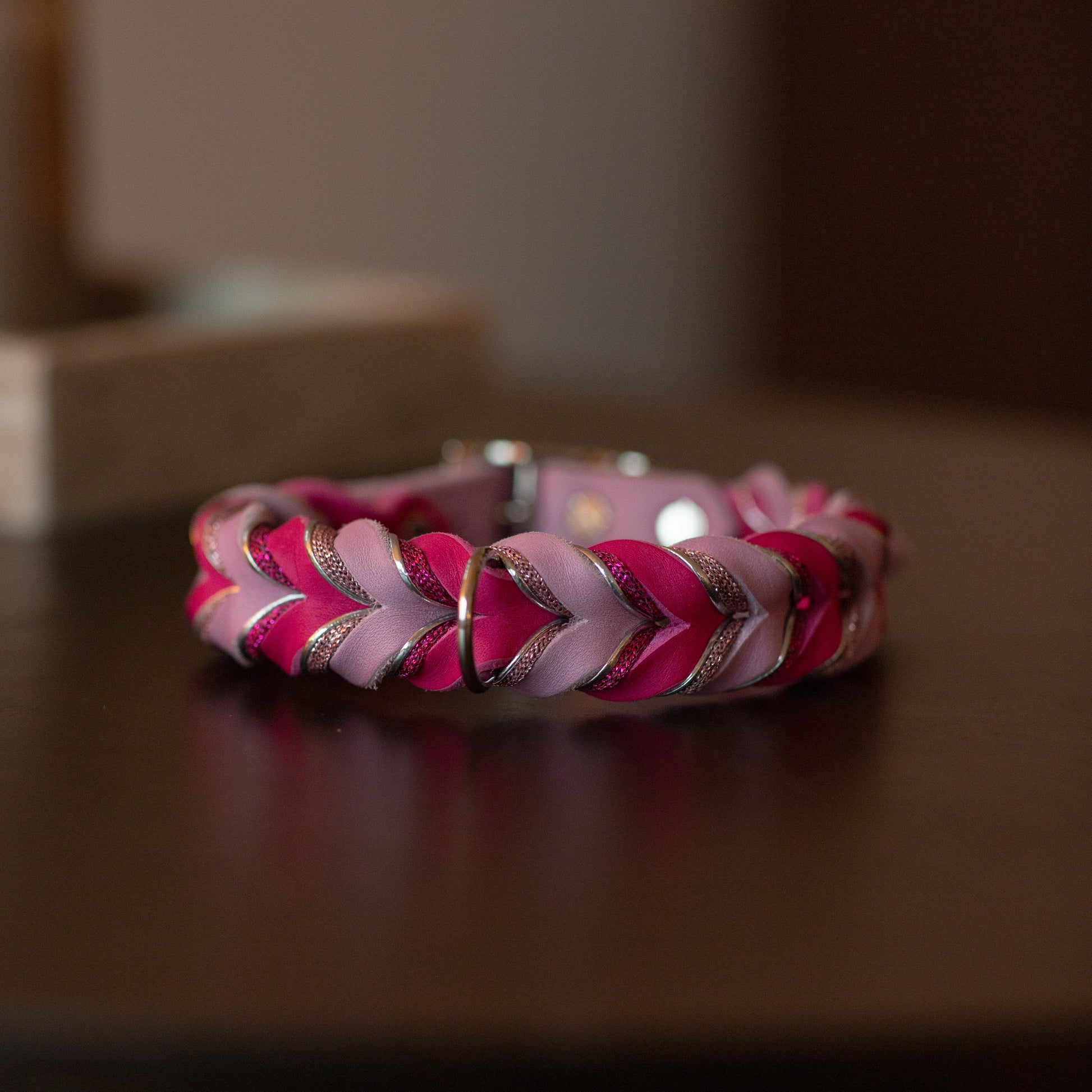 Fast halsband med ljusrosa som bas och starkrosa i flätningen. Matchande glitterband i rosa och ett smalt silverband som binder ihop detaljerna med metallen i silver.