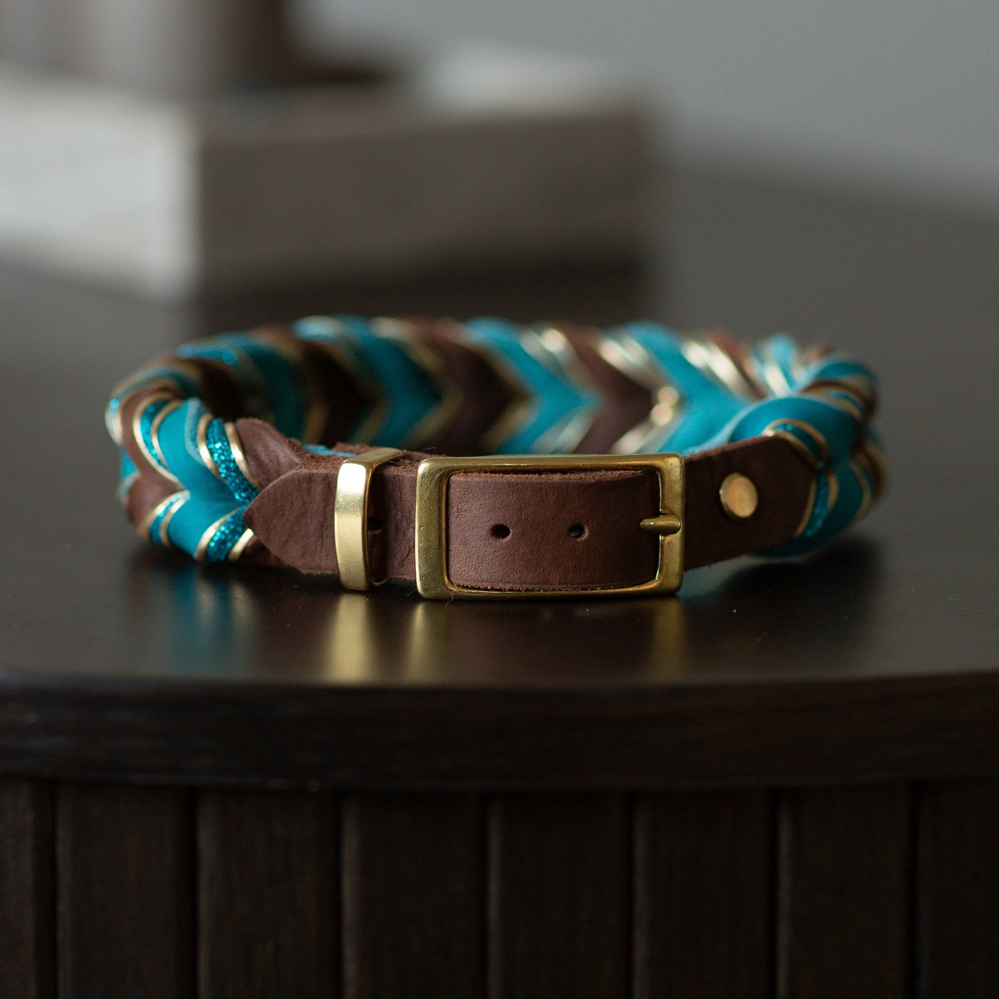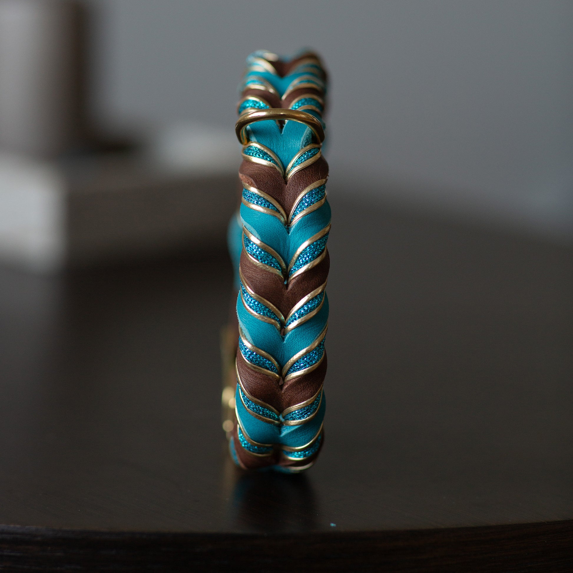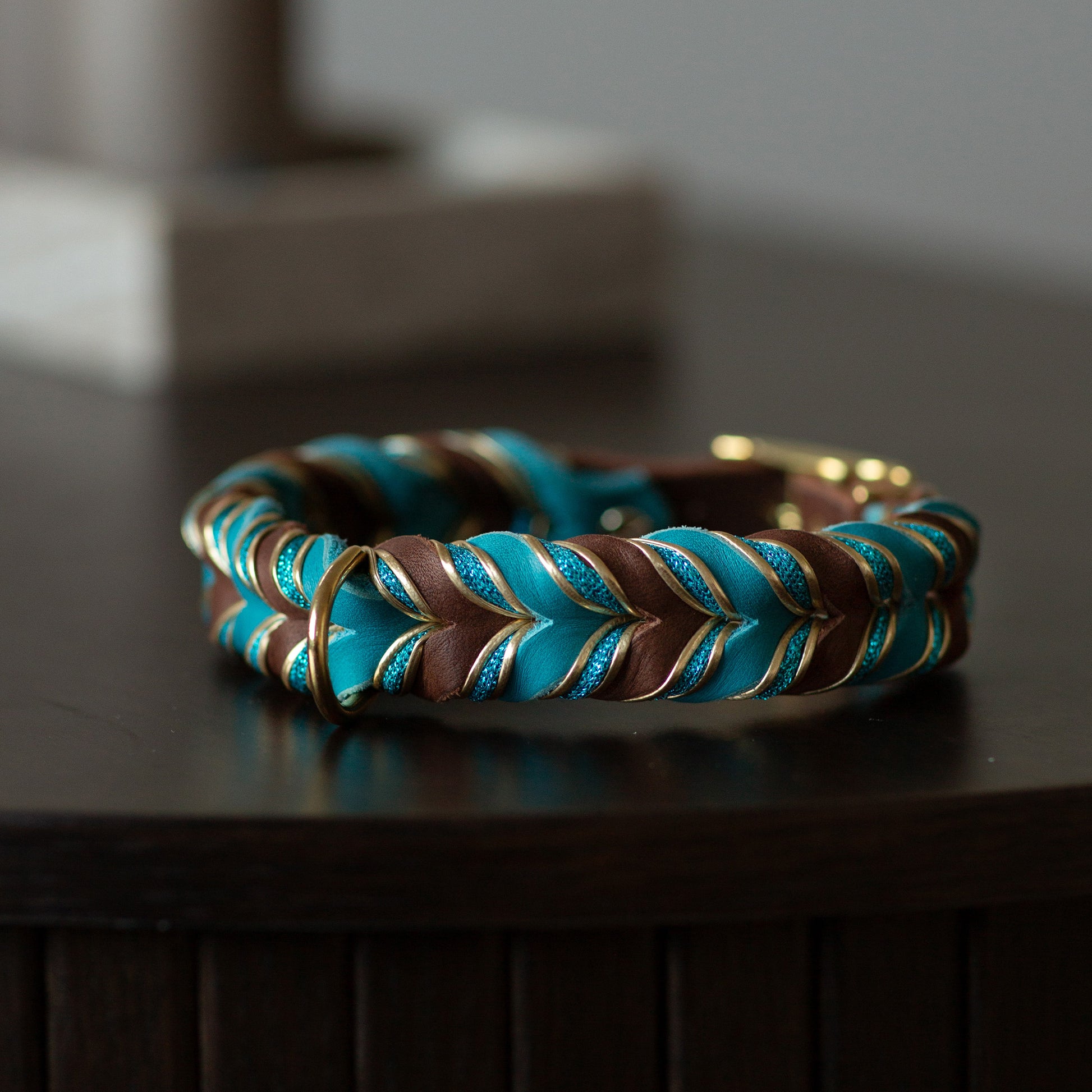 Fast halsband med läderfärgerna Nougat som bas och turkos i flätningen. Glitterband i matchande färger och smalt guldband som binder ihop detaljerna i den flätade delen med de guldiga metalldetaljerna.