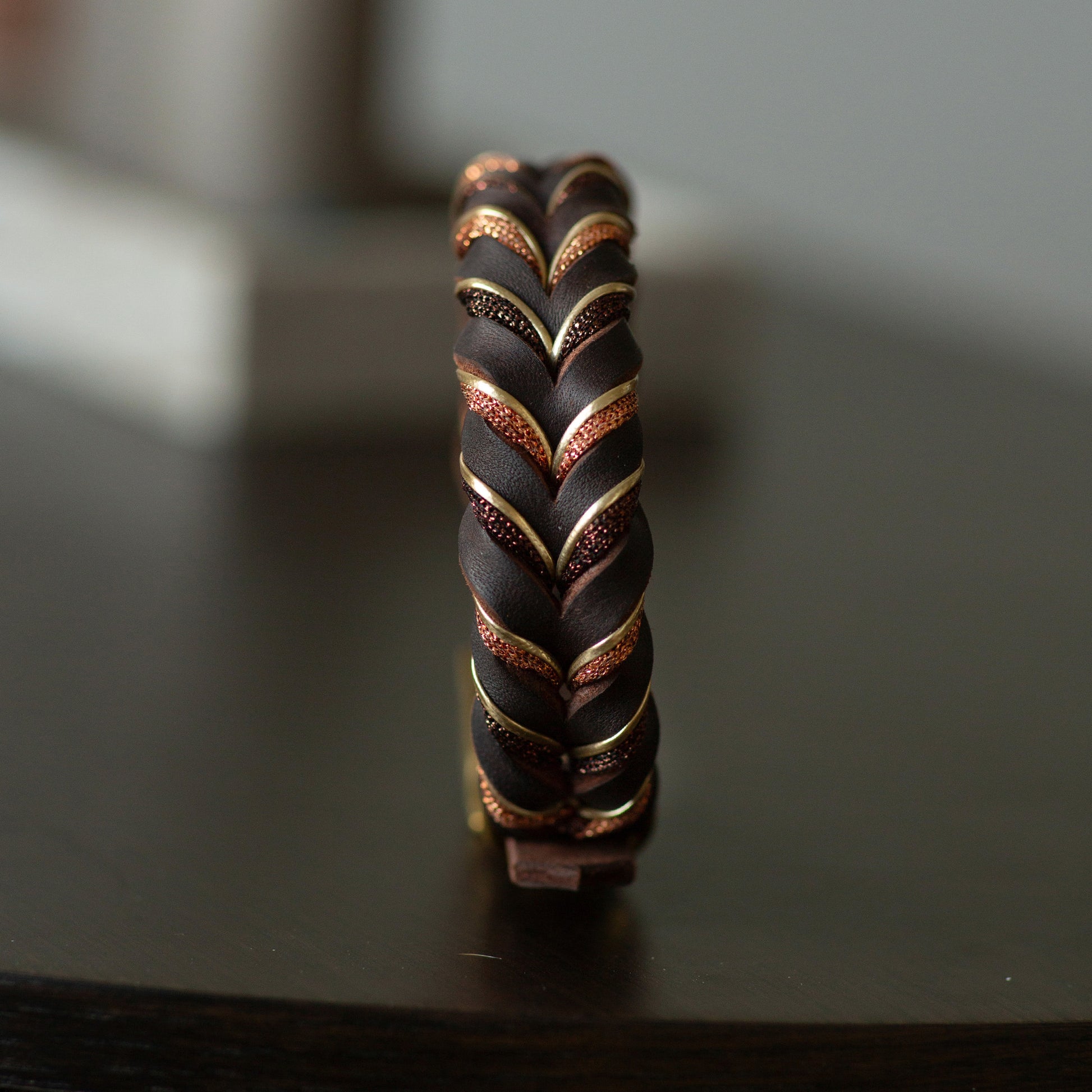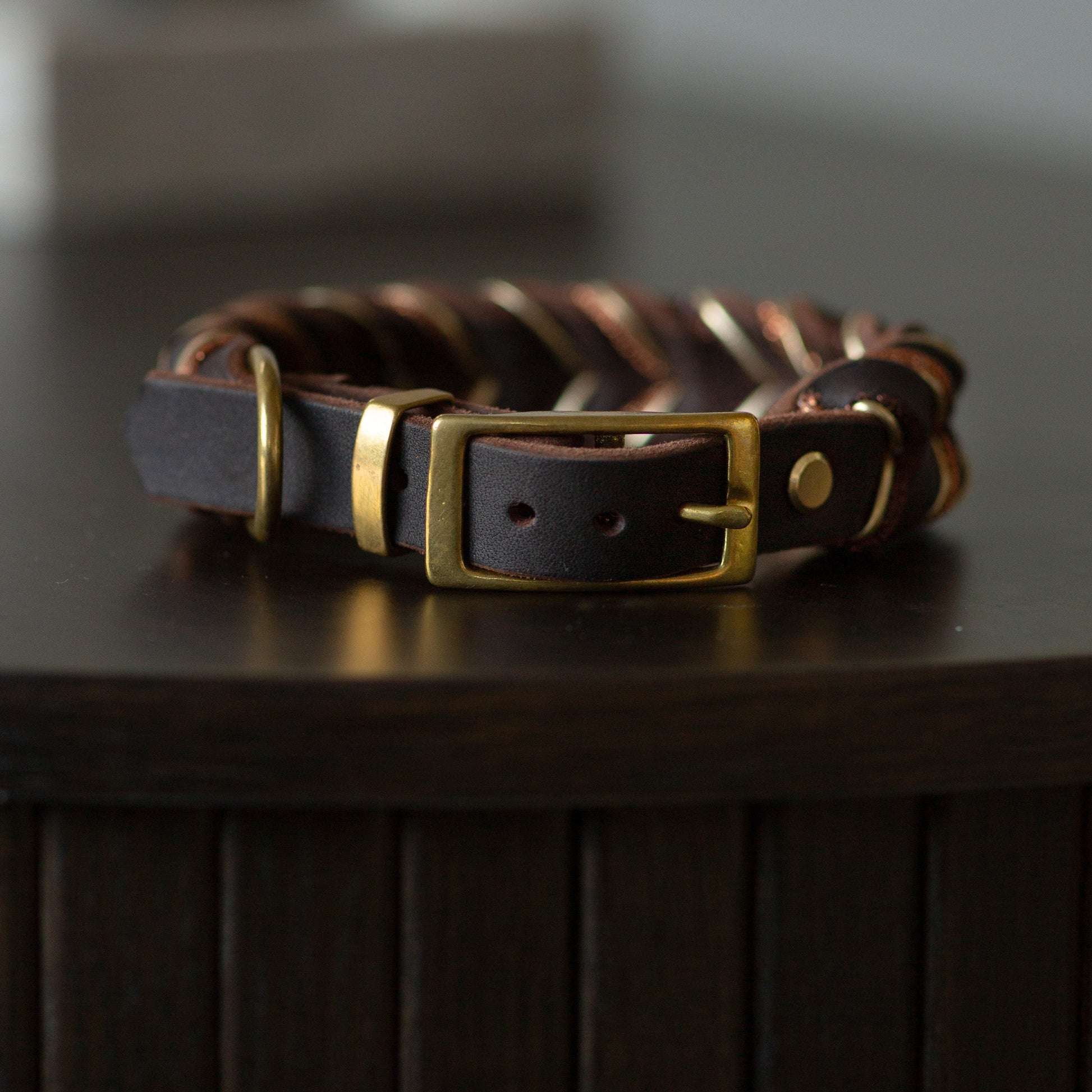 Fast halsband med läderfärgen brun . Glitterband i matchande färger och smalt guldband som binder ihop detaljerna i den flätade delen med de guldiga metalldetaljerna.