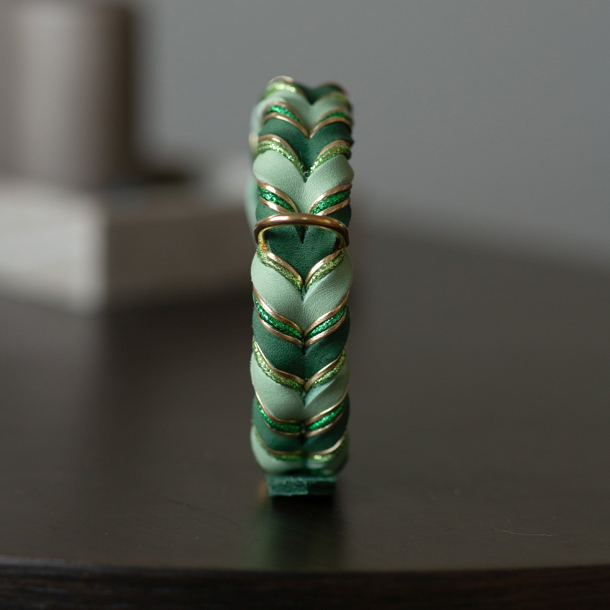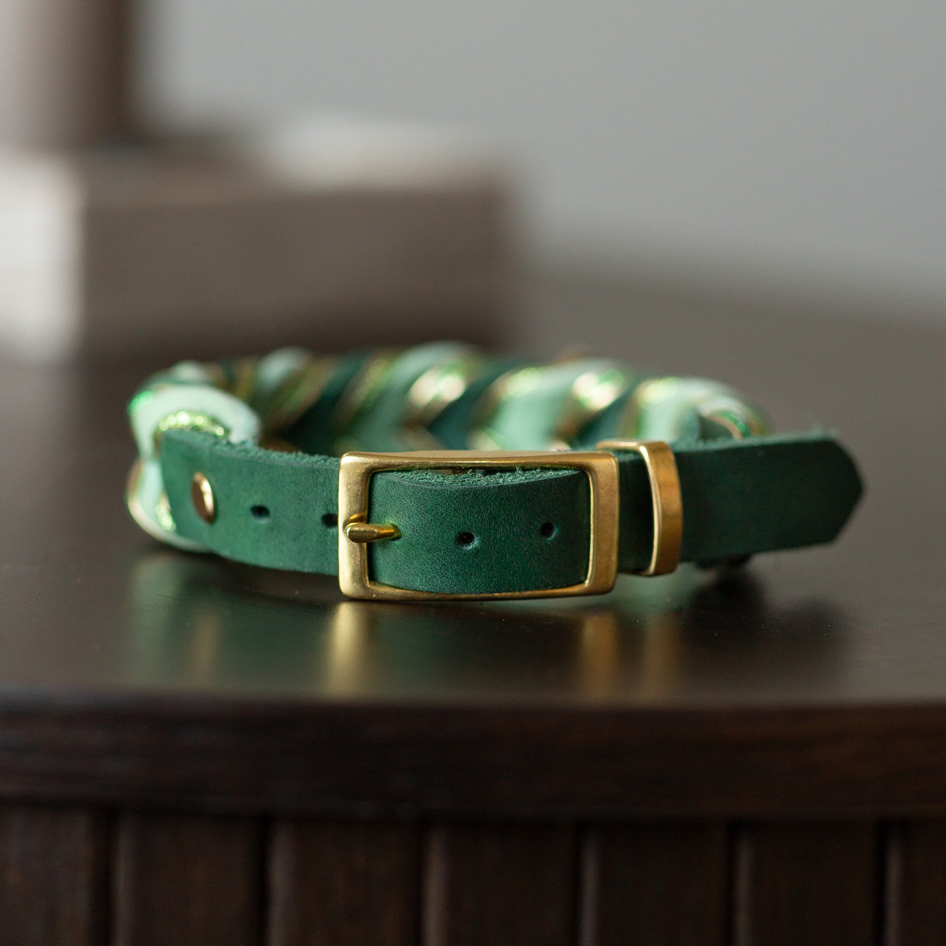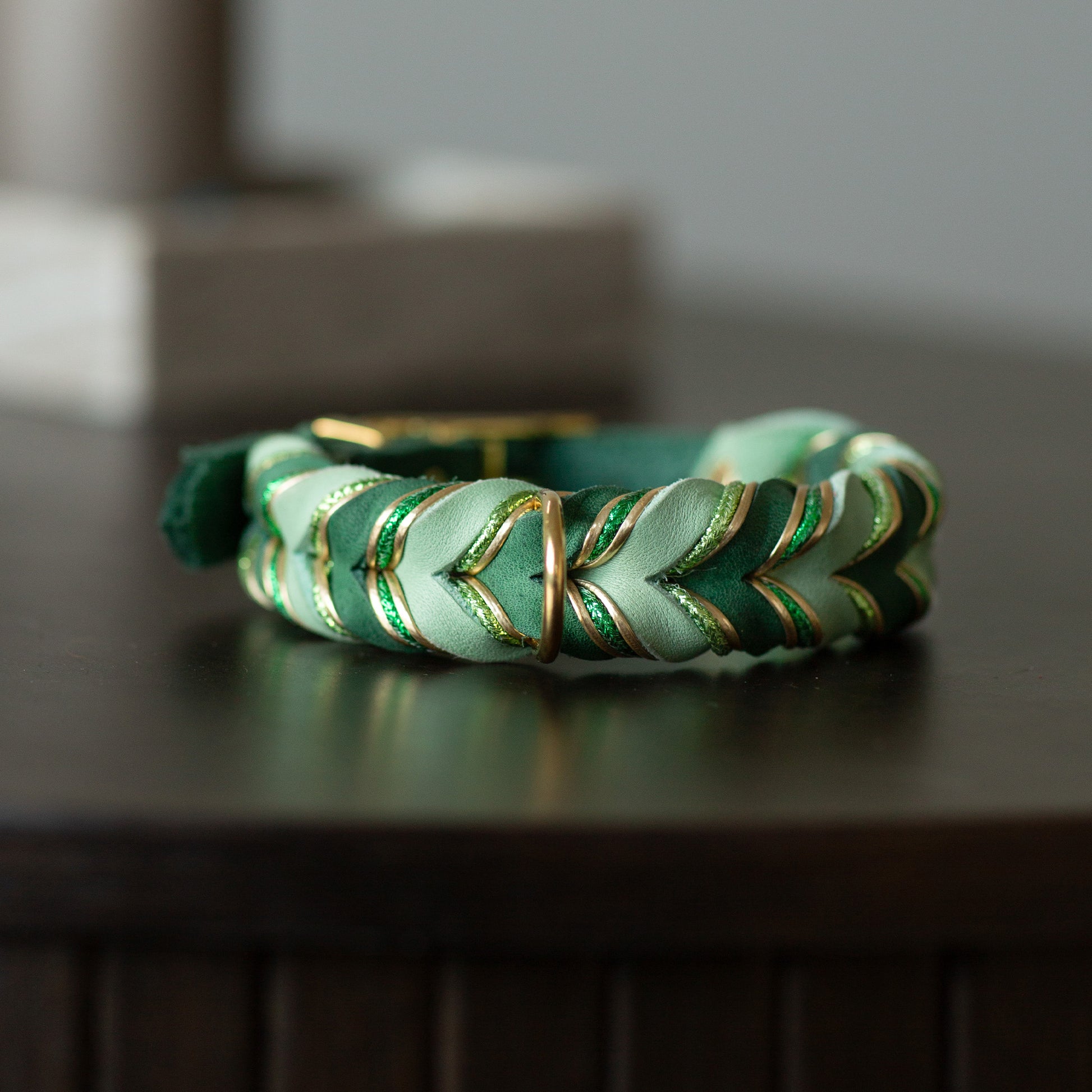 Fast halsband med läderfärgerna mörkgrön som bas och ljusgrön i flätningen. Glitterband i matchande färger och smalt guldband som binder ihop detaljerna i den flätade delen med de guldiga metalldetaljerna.