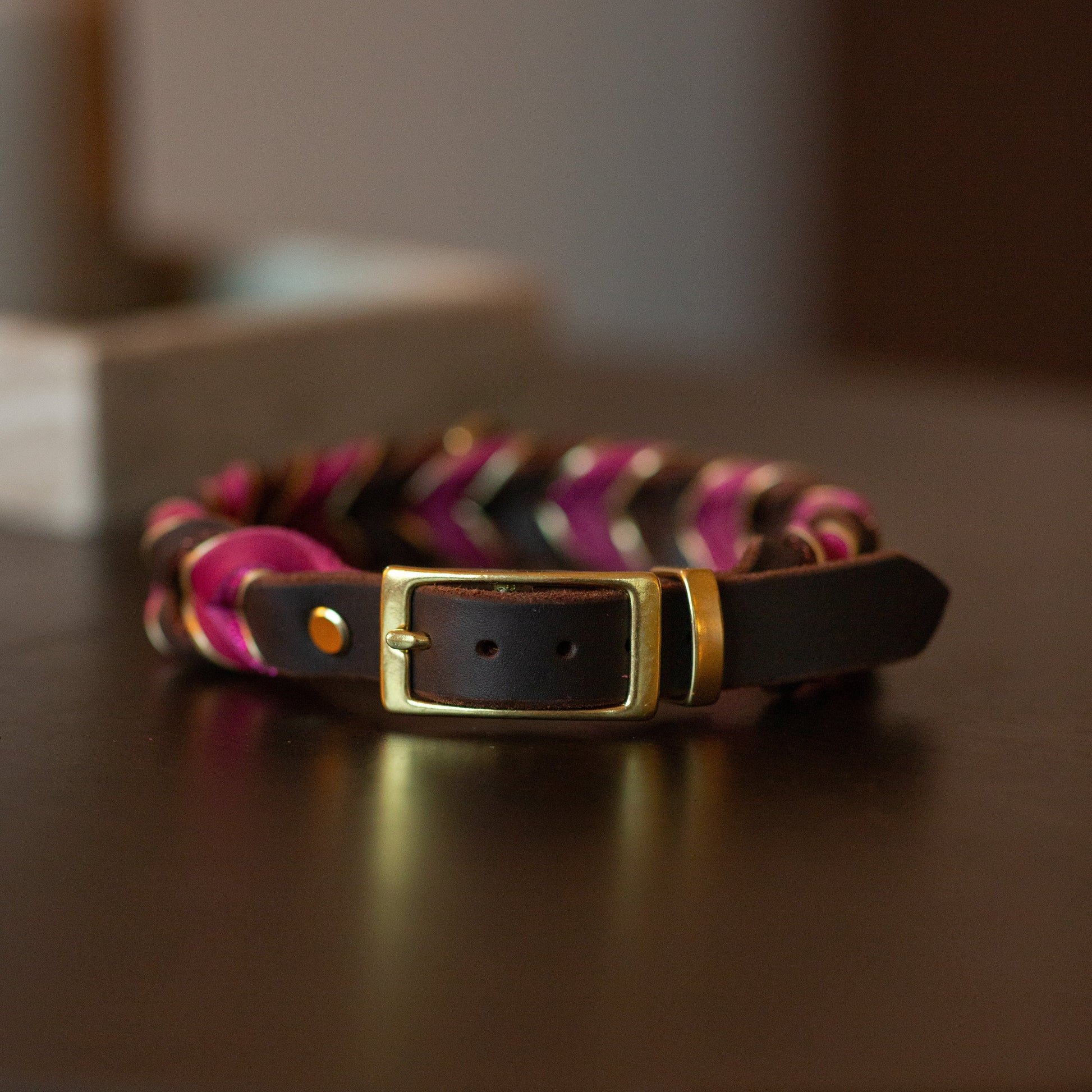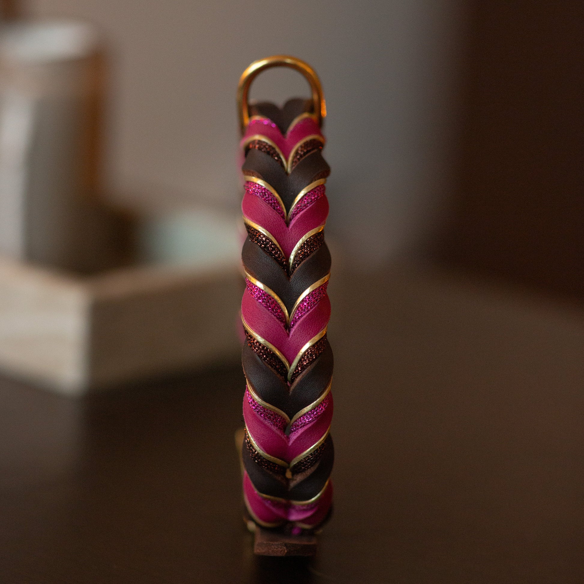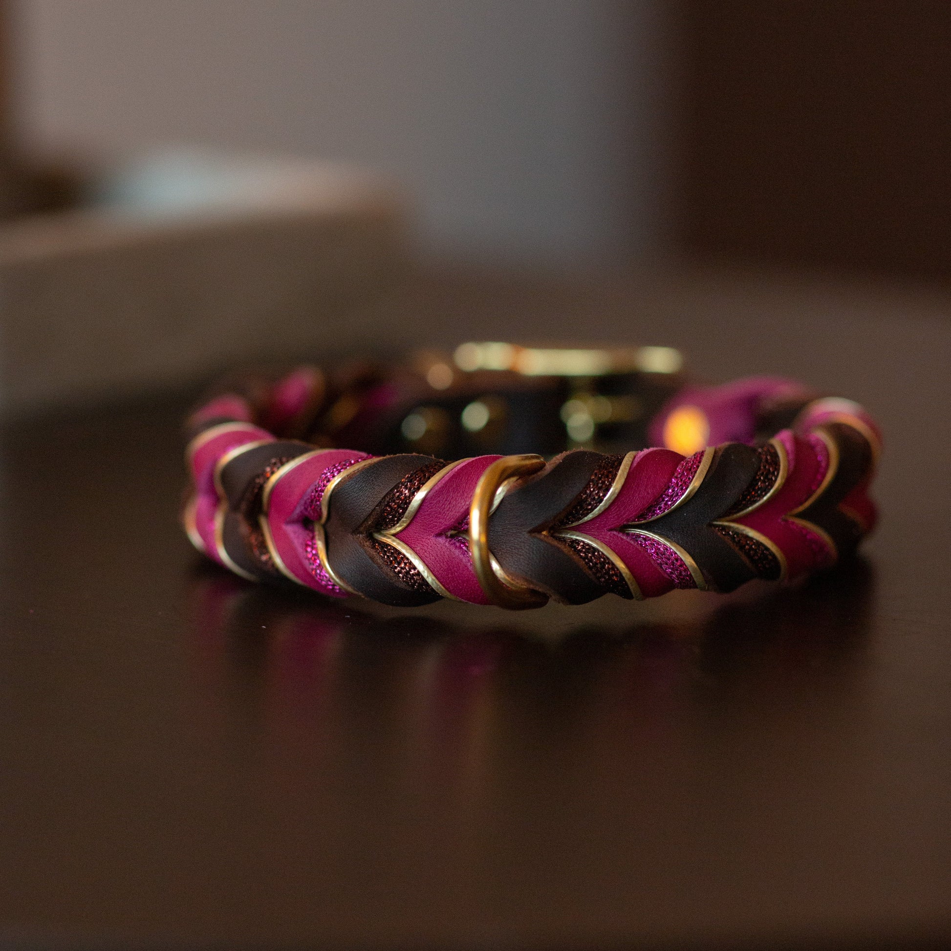 Fast halsband med brun som bas och mörkrosa i flätningen. Matchande glitterband i rosa och brunt och ett smalt guldband som binder ihop detaljerna med metallen i mässing.