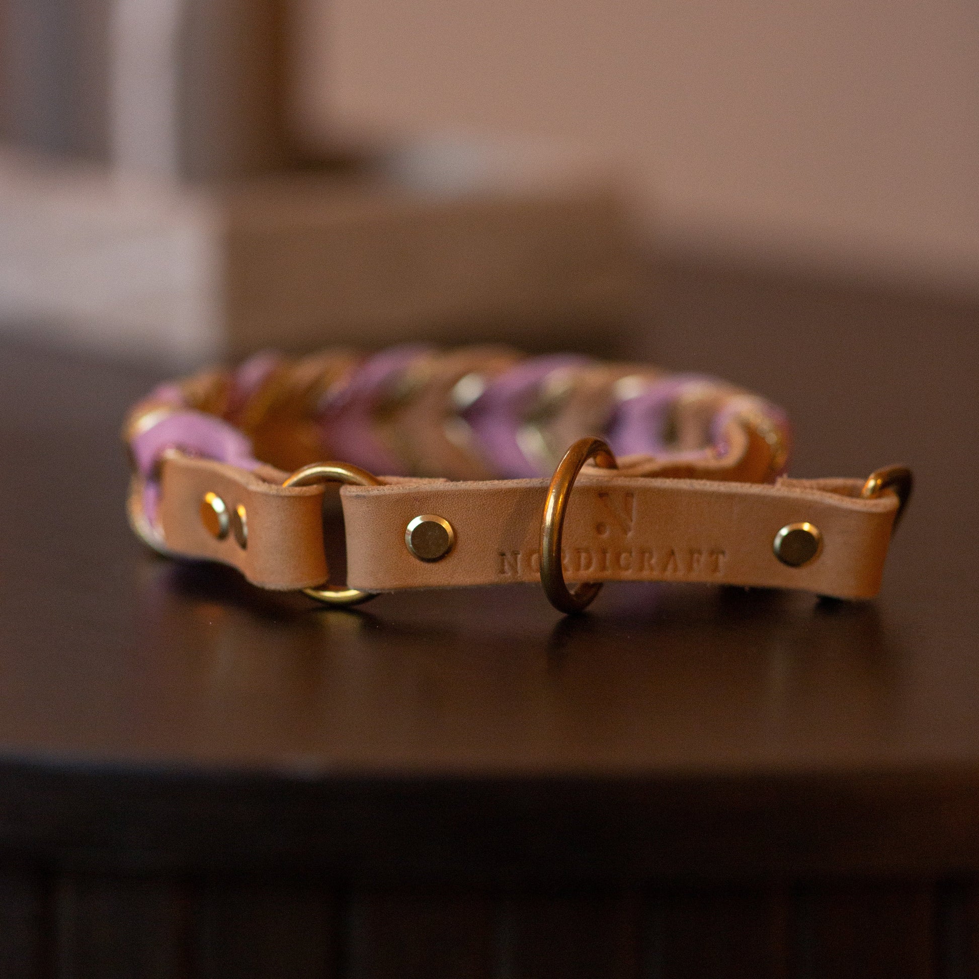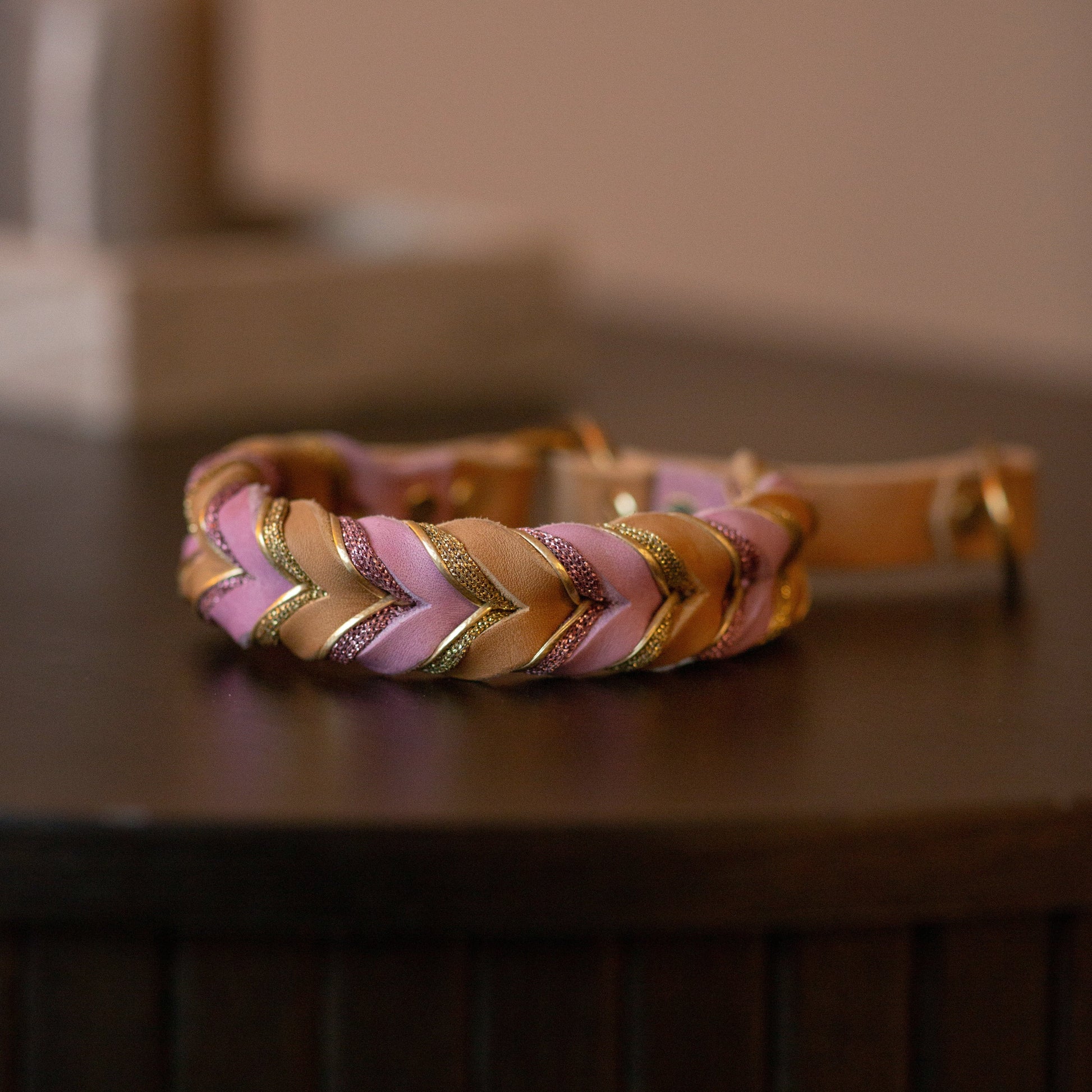 Halvstryp med beige som bas och ljusrosa i flätningen. Matchande glitterband i ljusrosa och guld och ett smalt guldband som binder ihop detaljerna med metallen i mässing.