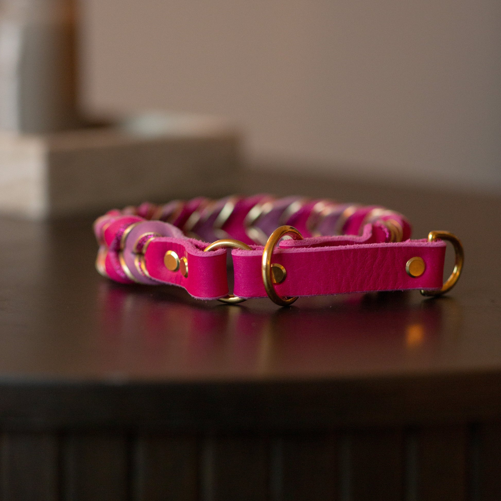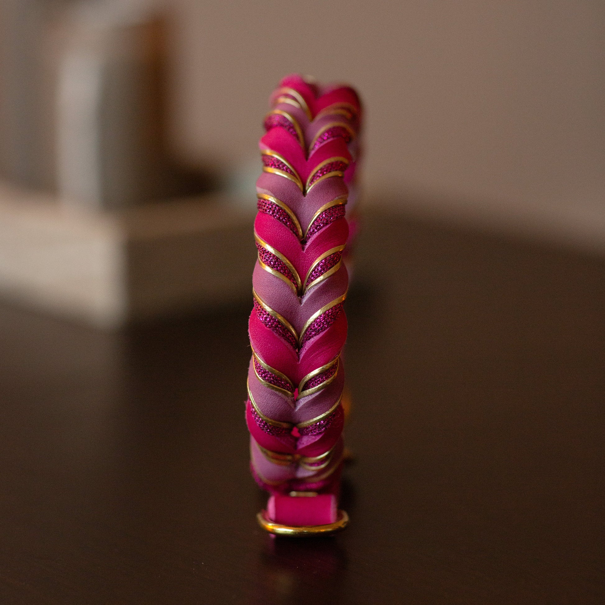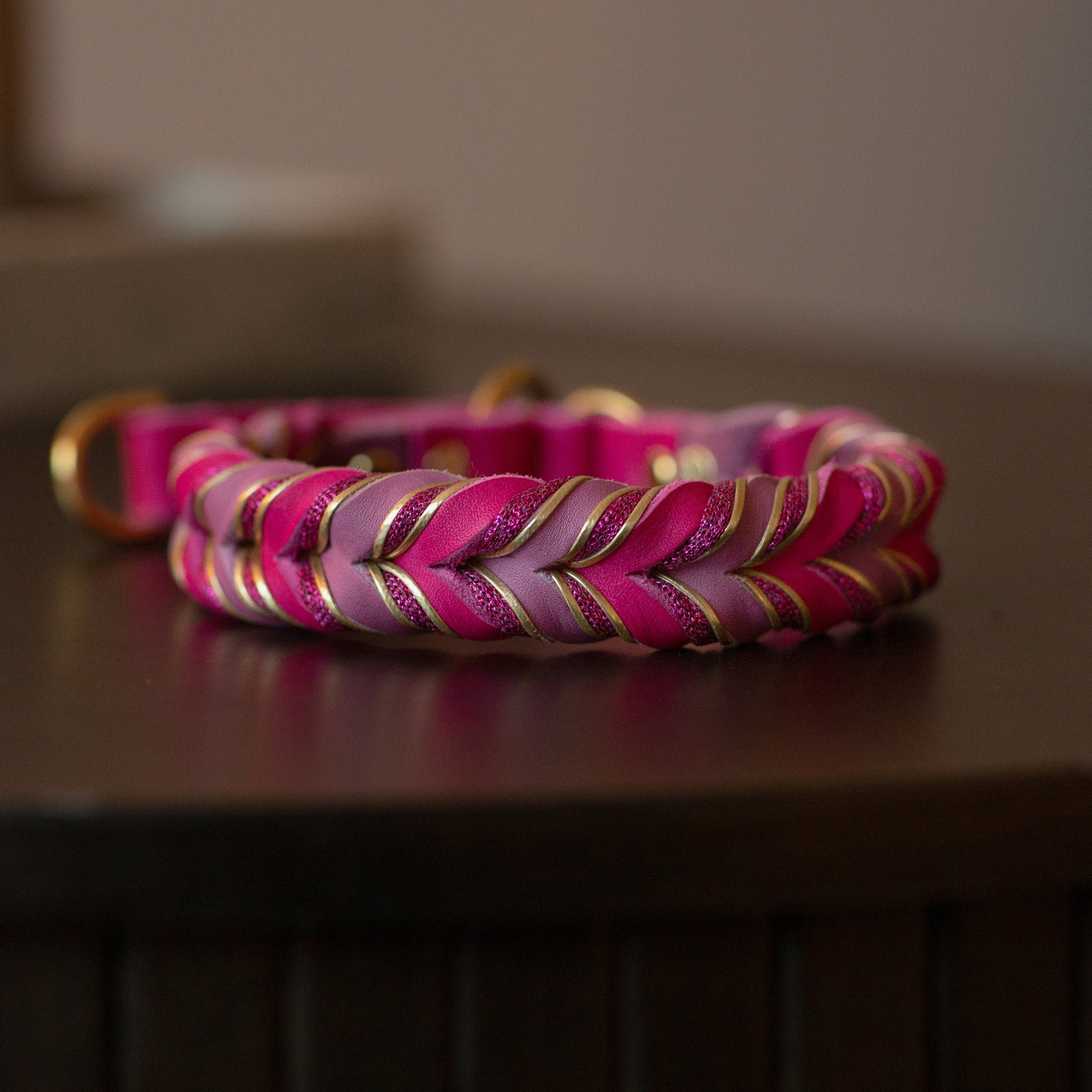 Halvstryp med starkrosa som bas och ljusrosa i flätningen. Matchande glitterband och ett smalt guldband som binder ihop detaljerna med metallen i mässing.