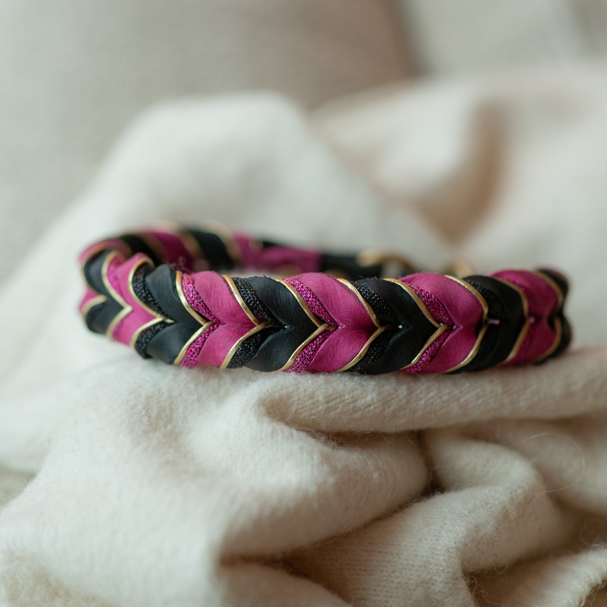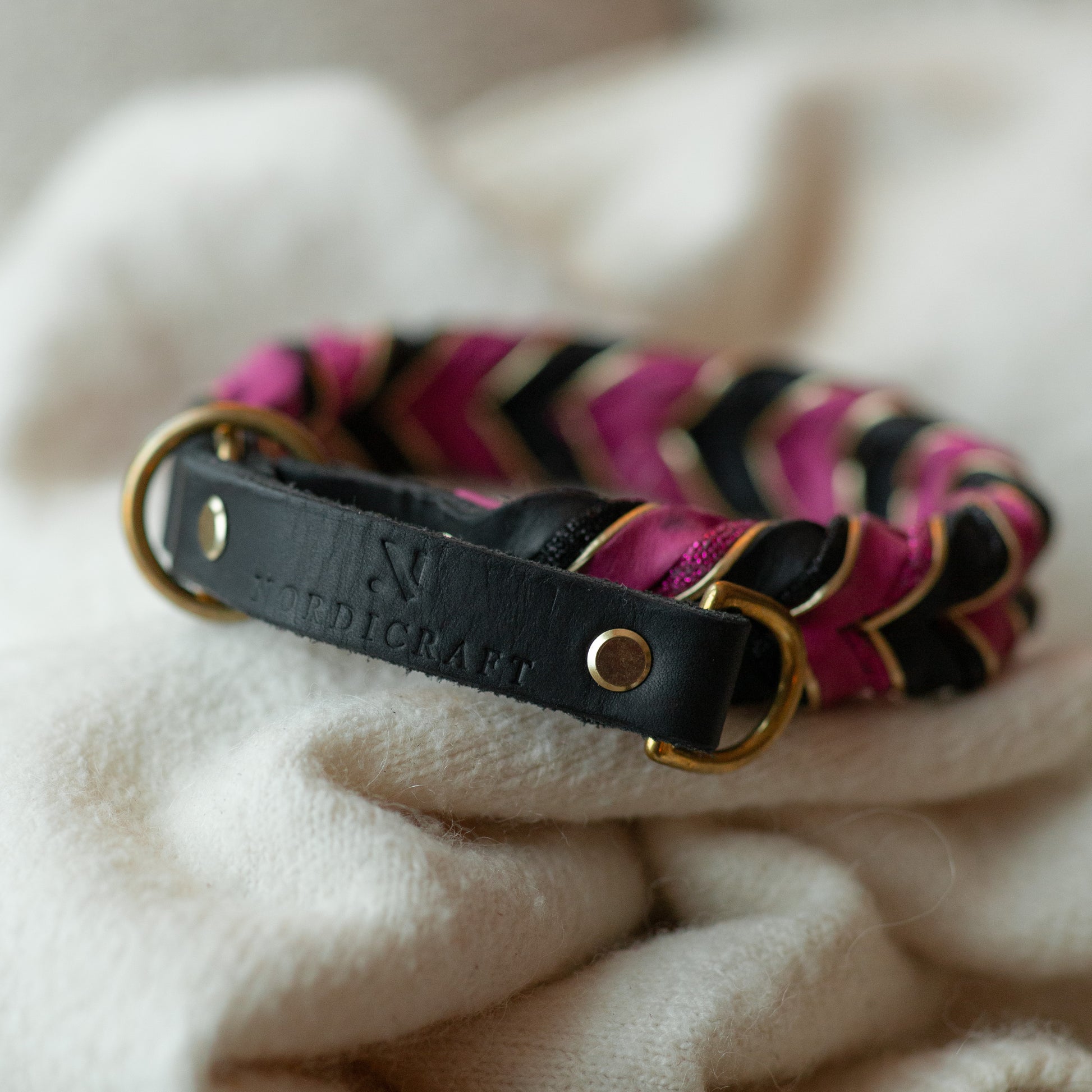 Halvstryp gjort av det gamla lädret i färgen svart i basen och starkrosa i flätningen. Denna produkt är utav den gamla designen med dubbla nitar. Ingenting som påverkar funktionen eller hållbarheten.