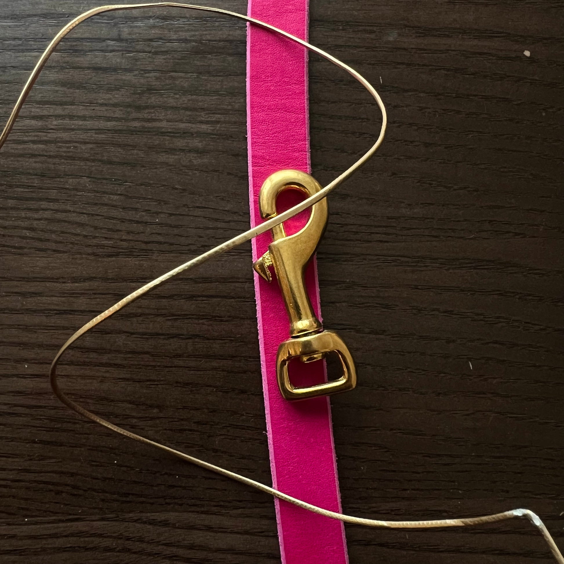 Koppel i färgen starkrosa på 200cm ex koppelhaken. Glitterband och smalt guldband i flätningen nere vid haken. Reflextråd inflätad i glitterbandet. Metall i mässingfärg.