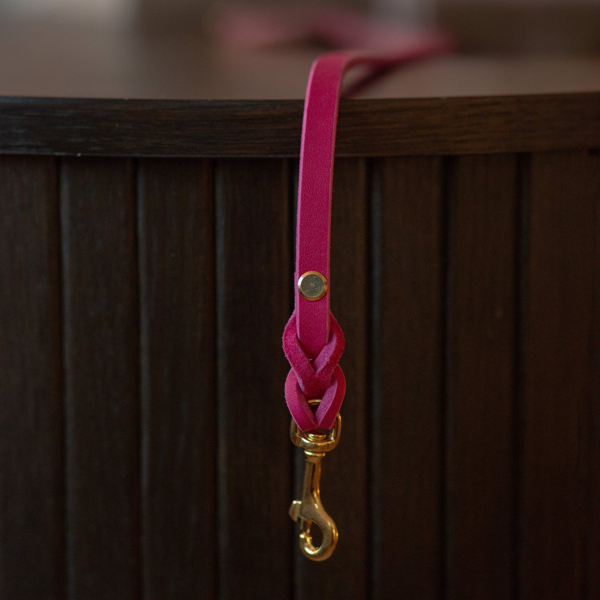 Kortkoppel i starkrosa med metall i mässing. Perfekt att använda när man tränar och snabbt och enkelt behöver kunna koppla/släppa hunden. Smalt och smidigt att stoppa i jackfickan.
