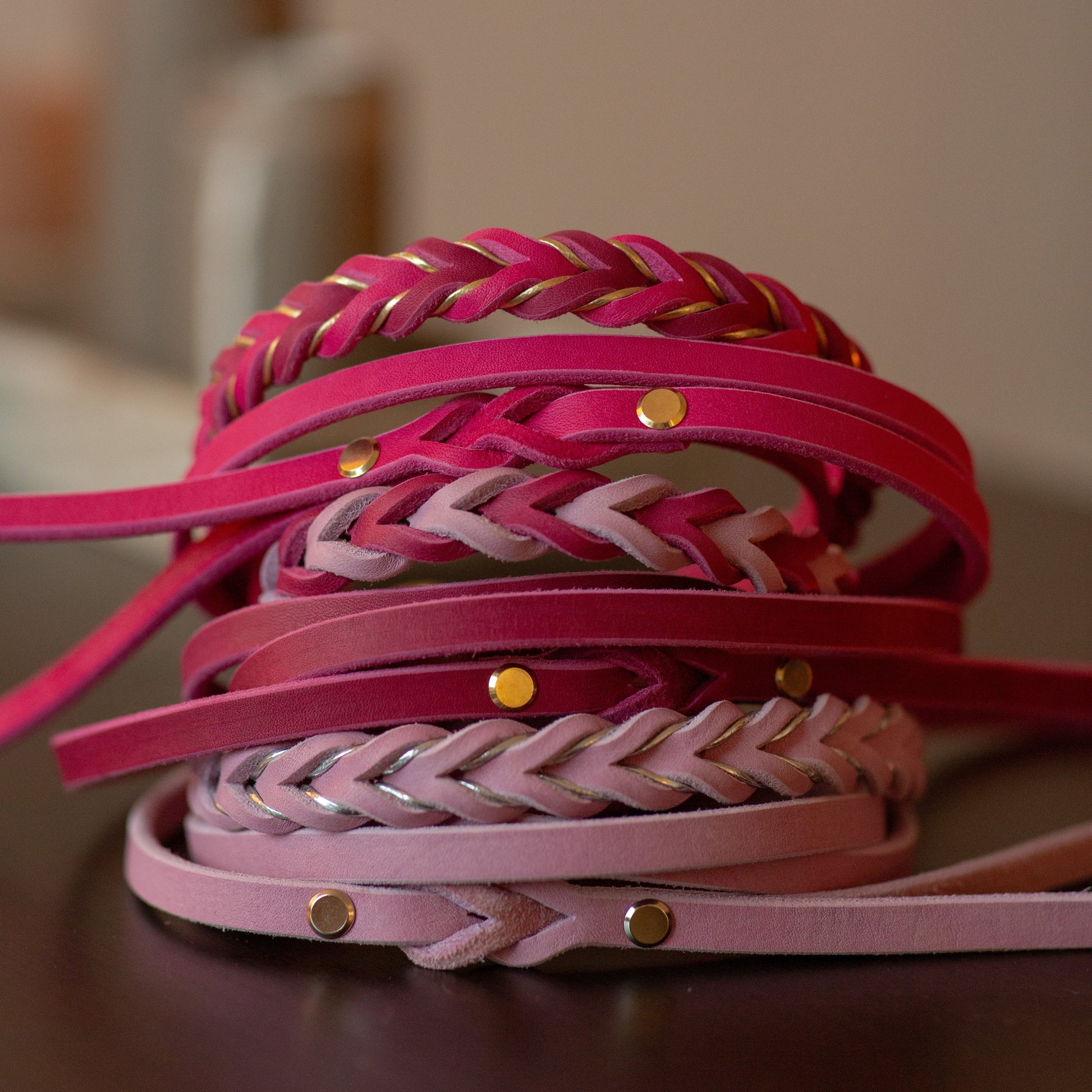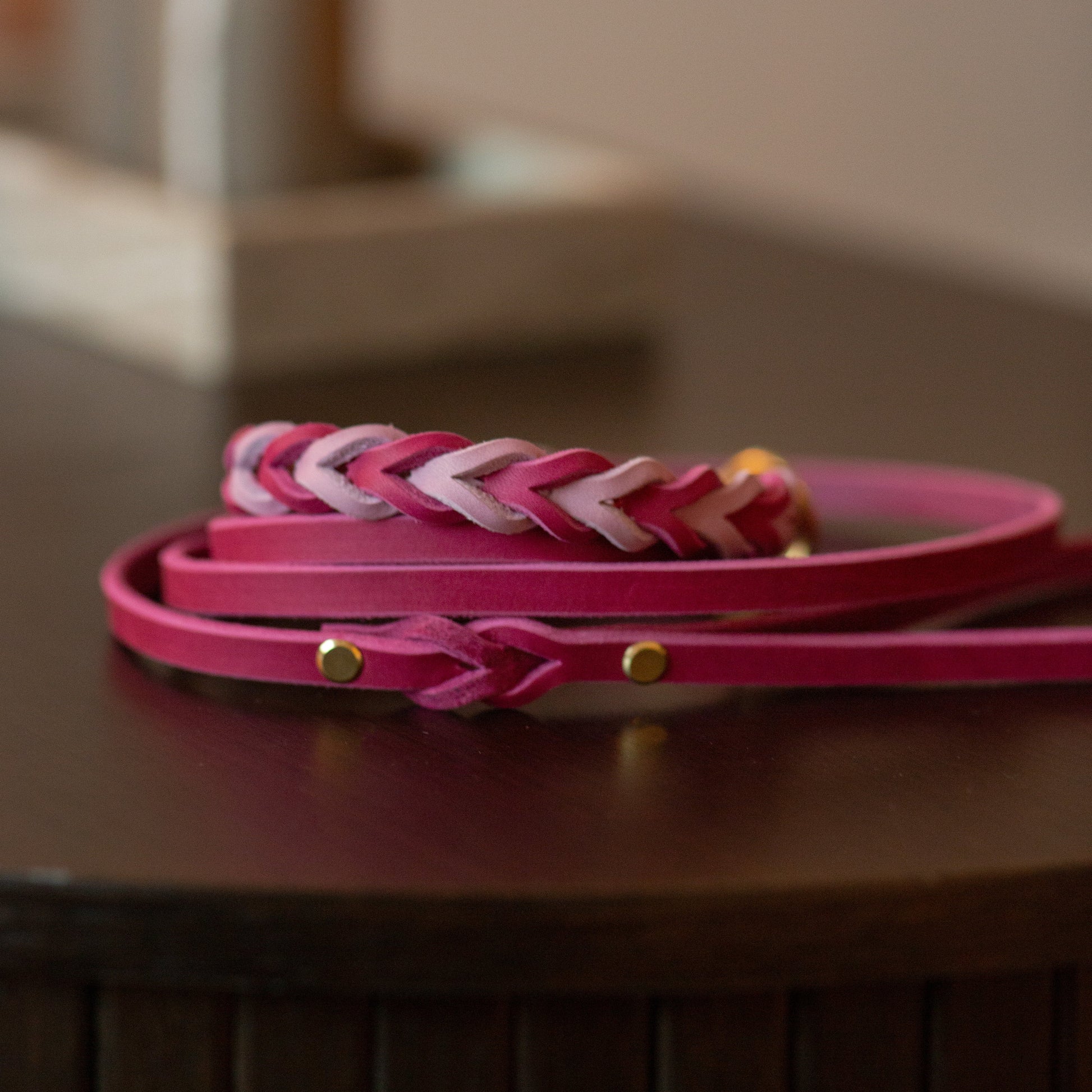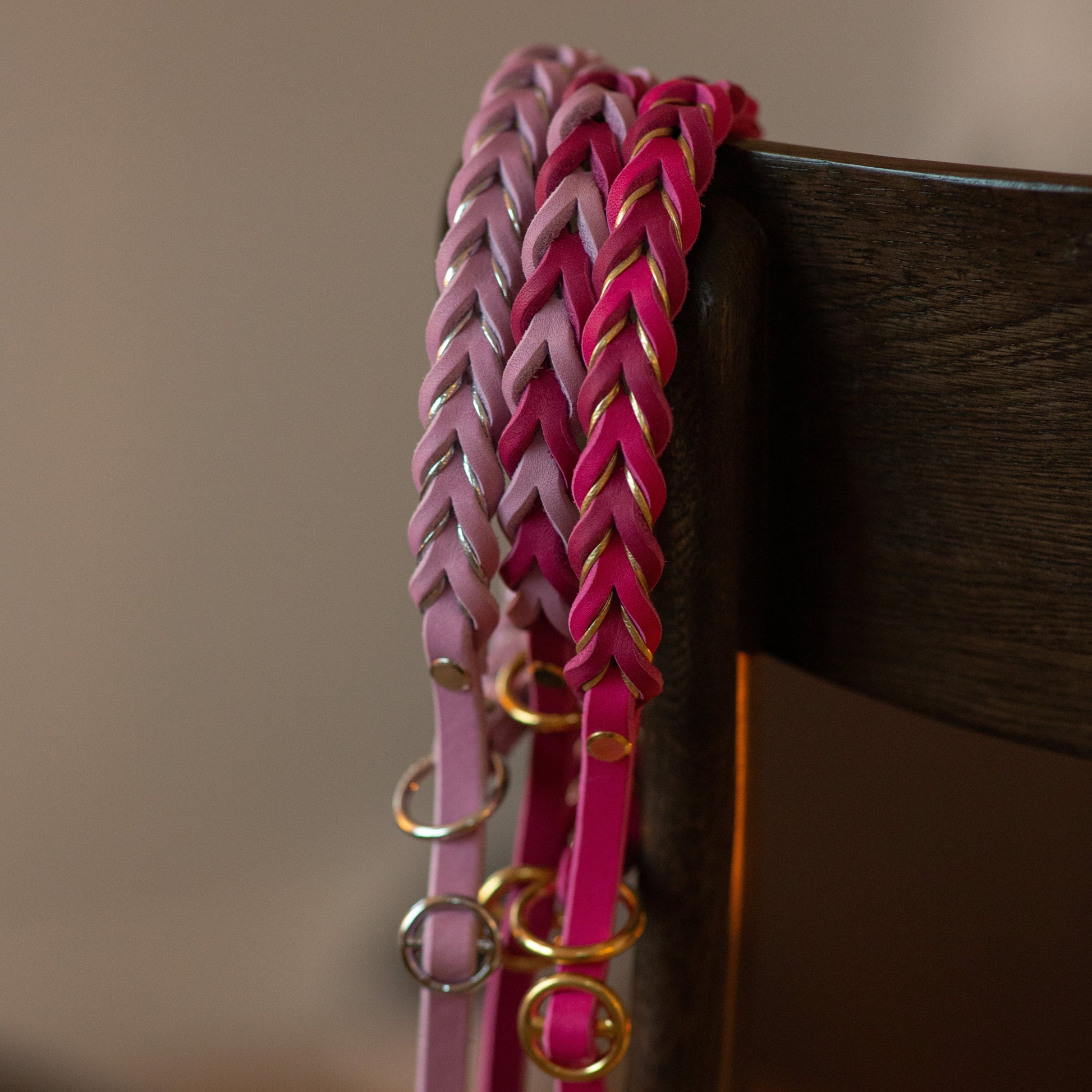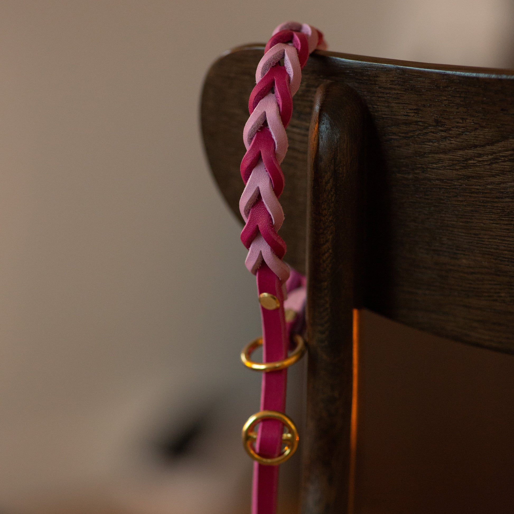 Retrieverkoppel med bas mörkrosa och ljusrosa i flätningen. Metall i mässing.