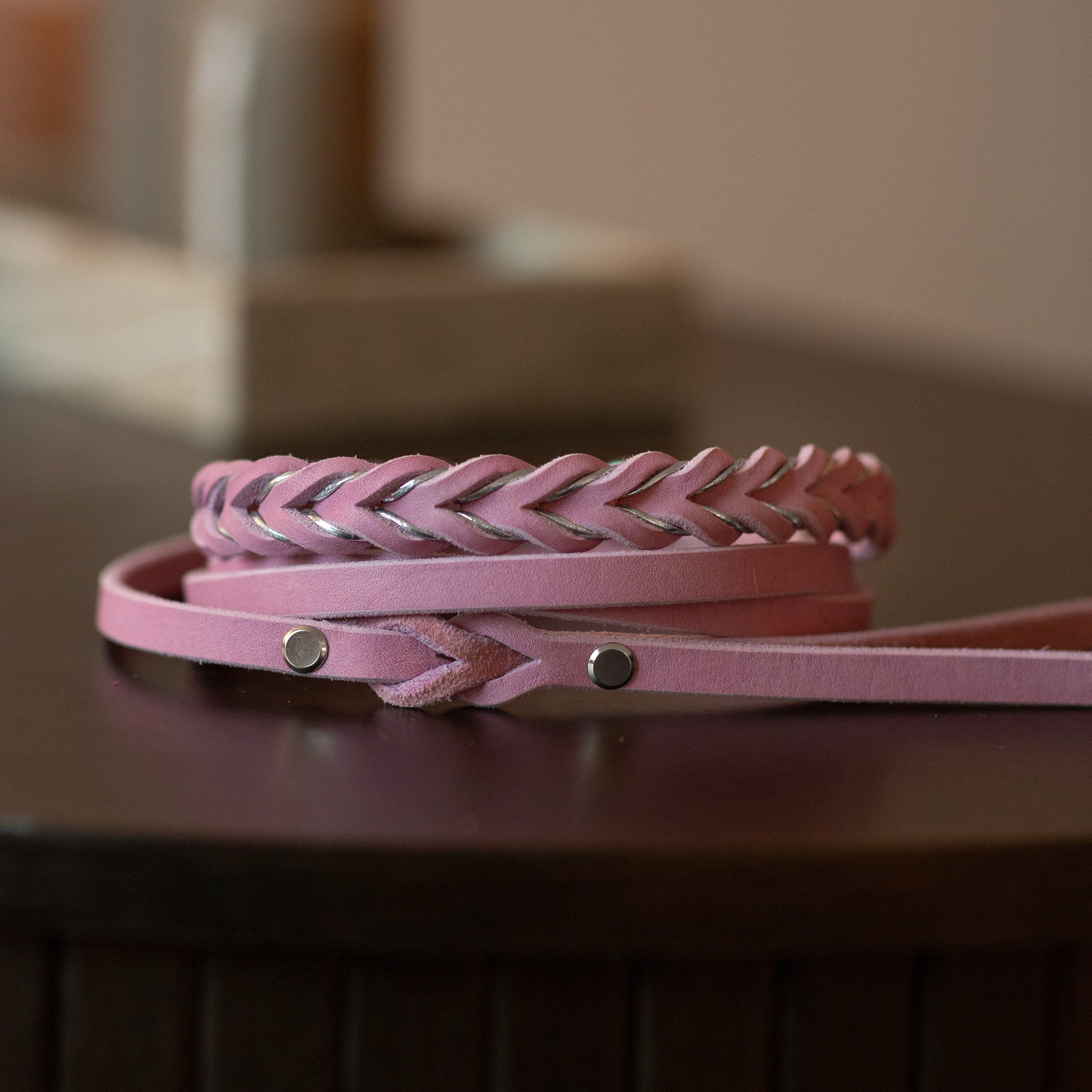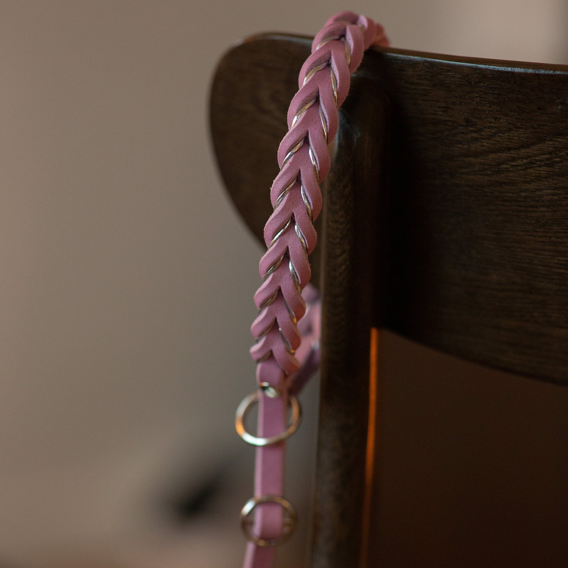 Retrieverkoppel i ljusrosa med smalt silverband som binder ihop detaljerna med metallen i silver.