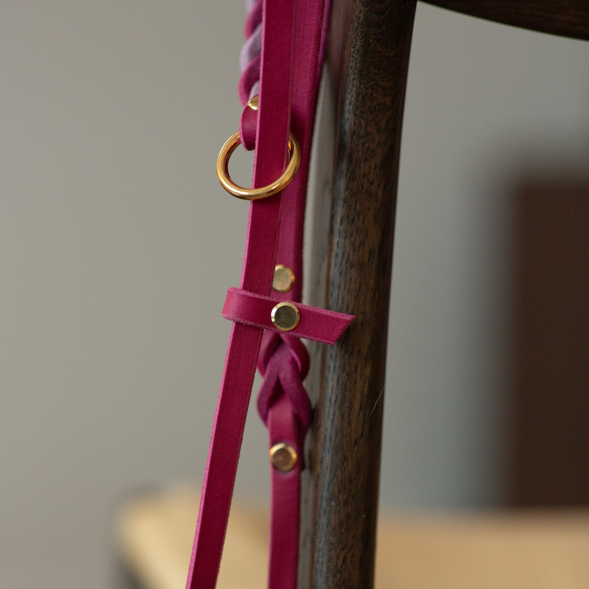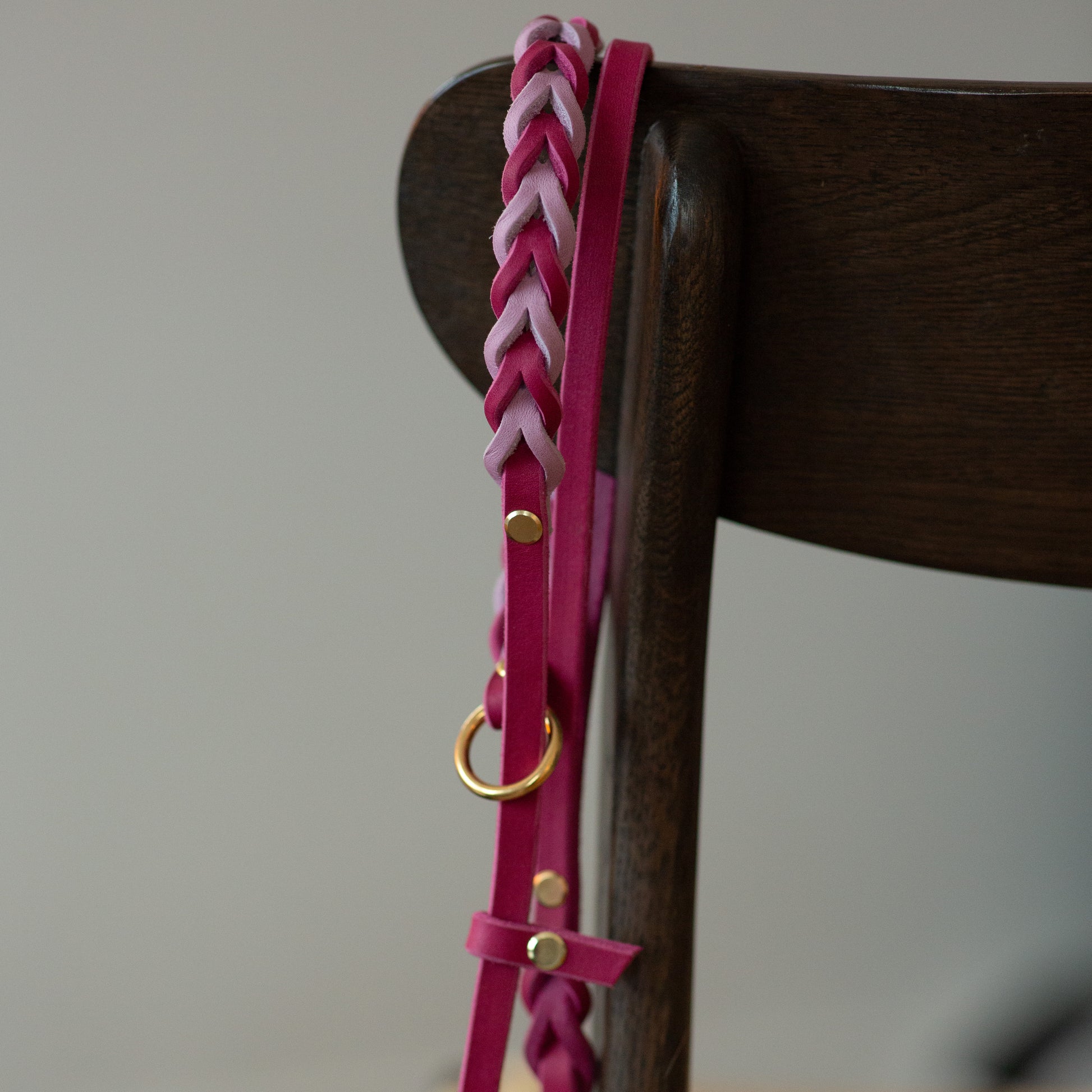 Retrieverkoppel med bas i mörkrosa och ljusrosa i flätningen. Metall i mässing. Detta retrieverkoppel har ett läderstopp istället för stopp-ring i metall. Det är inget som påverkar varken funktion eller hållbarhet.